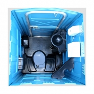 Caixa de dejetos com assento, porta papel higiênico, piso antiderrapante em polietileno, identificação (masculino/feminino), descarga na caixa de dejeto com acionamento manual, ponto de ventilação natural, mictório, teto translúcido, fechadura de metal com sinalizador (livre/ocupado).